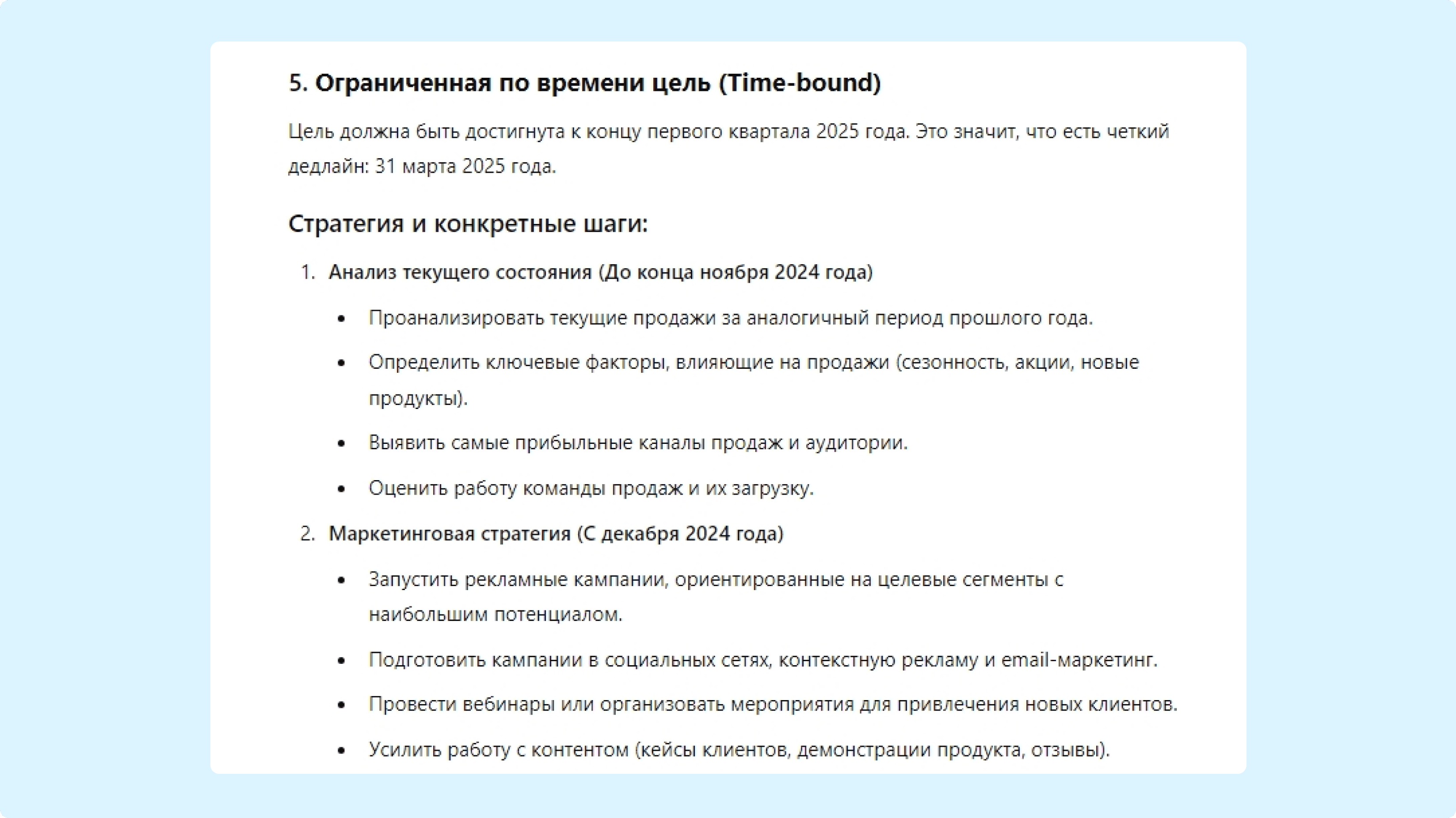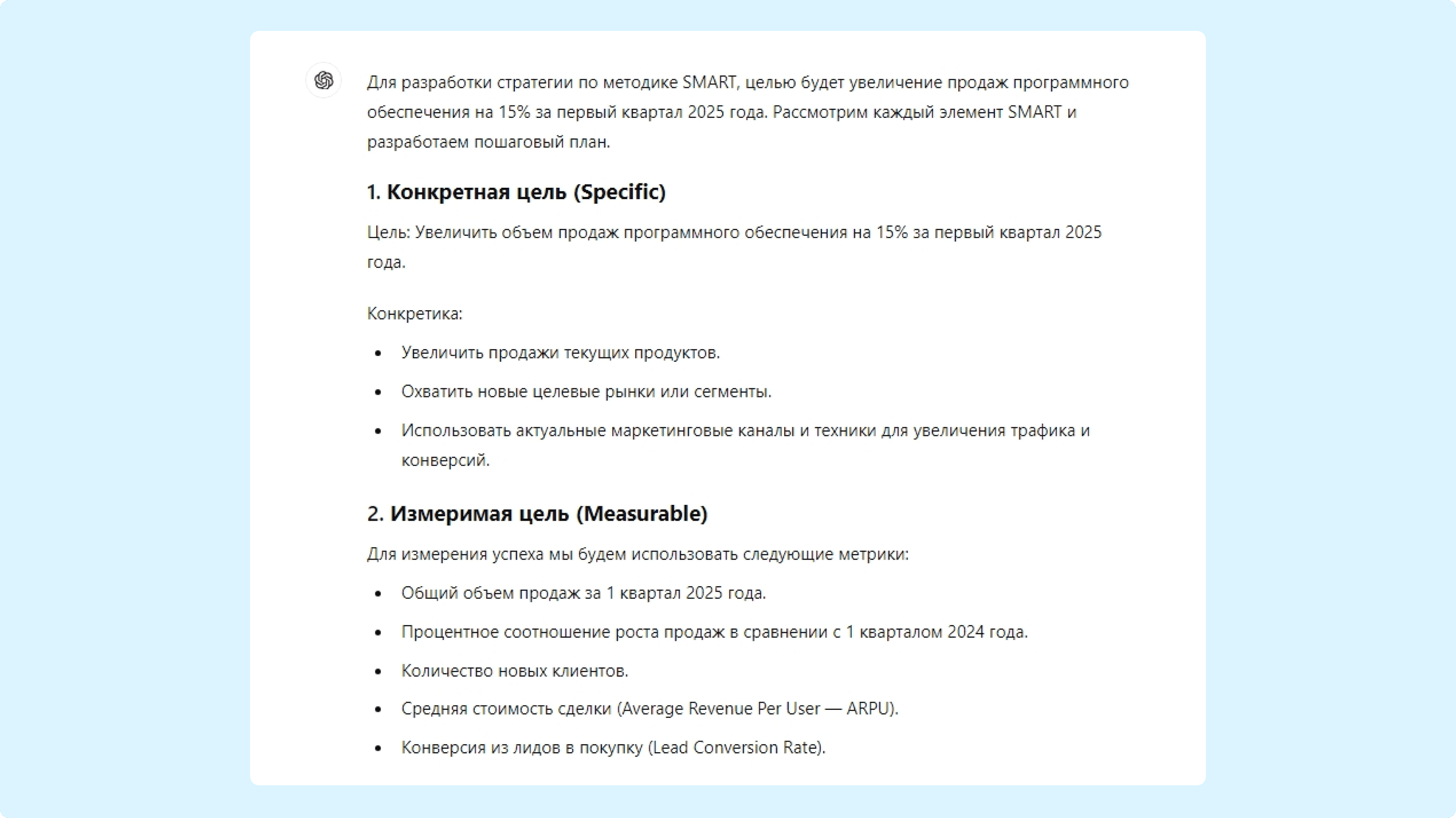 Чтобы протестировать промпт, скопируйте его и вместо «[Сюда вставьте вашу цель]» опишите свою задачу. Мы для примера написали такую: «Придумай максимально подробный план постановки цели по SMART для компании по продаже программного обеспечения. Задача — увеличить число продаж на 15% за первый квартал 2025 года».